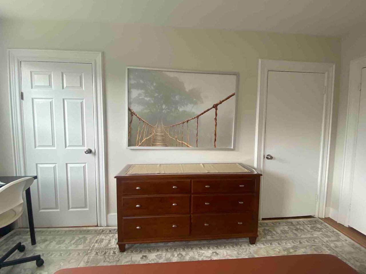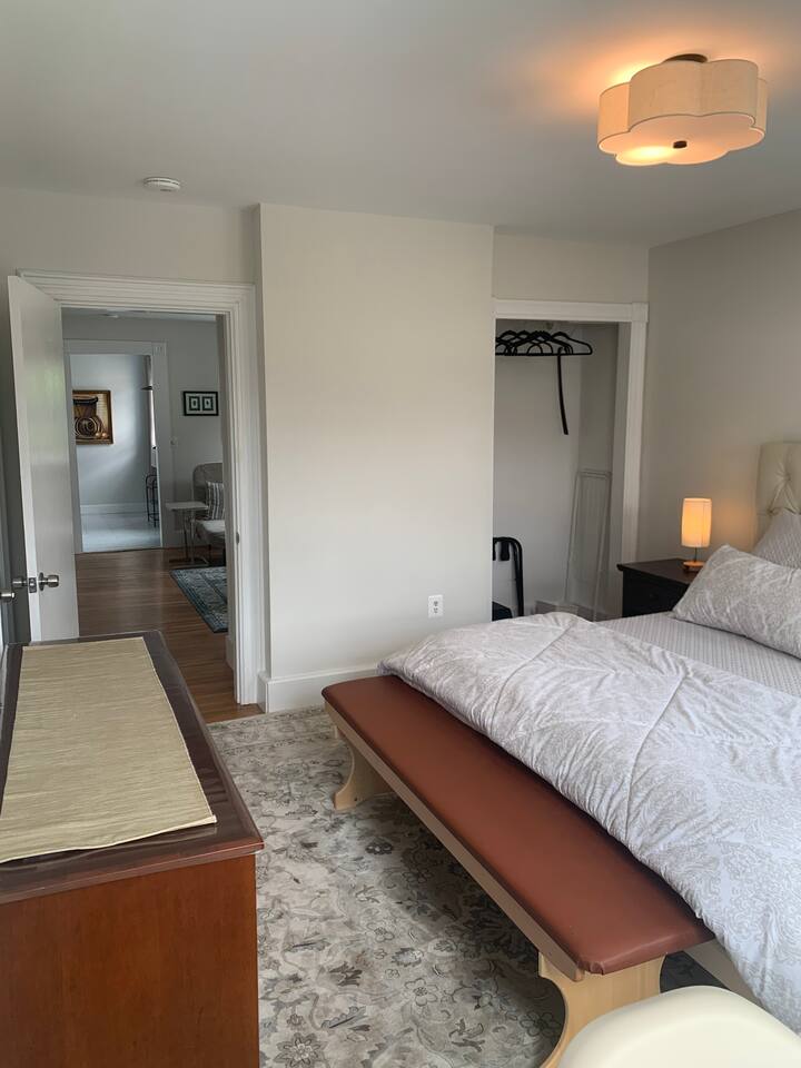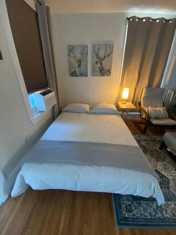 This condo is located on the 2nd floor. The private entrance to the condo is through the real of the home by the deck. The first bedroom is located on the second floor and has a luxurious king bed and workstation. Pillows, pillows, pillows! On the second floor you’ll also find the large fully equipped kitchen, living room, dinning room and full bathroom. The oversized second bedroom is located on the third floor, has a luxurious queen bed, and workstation. There is also a sleeping sofa in the living room. This is NOT a shared unit. Cleaners have access to second floor laundry through non-common area front door and hallway between the home's floors. Cleaners will not access any occupied units which are separated by locked doors. The condo is freshly painted, very clean and well-appointed with artwork and ALL the essentials to make your stay, no matter how long or short, comfortable and peaceful. The second floor deck is absolutely spectacular!
