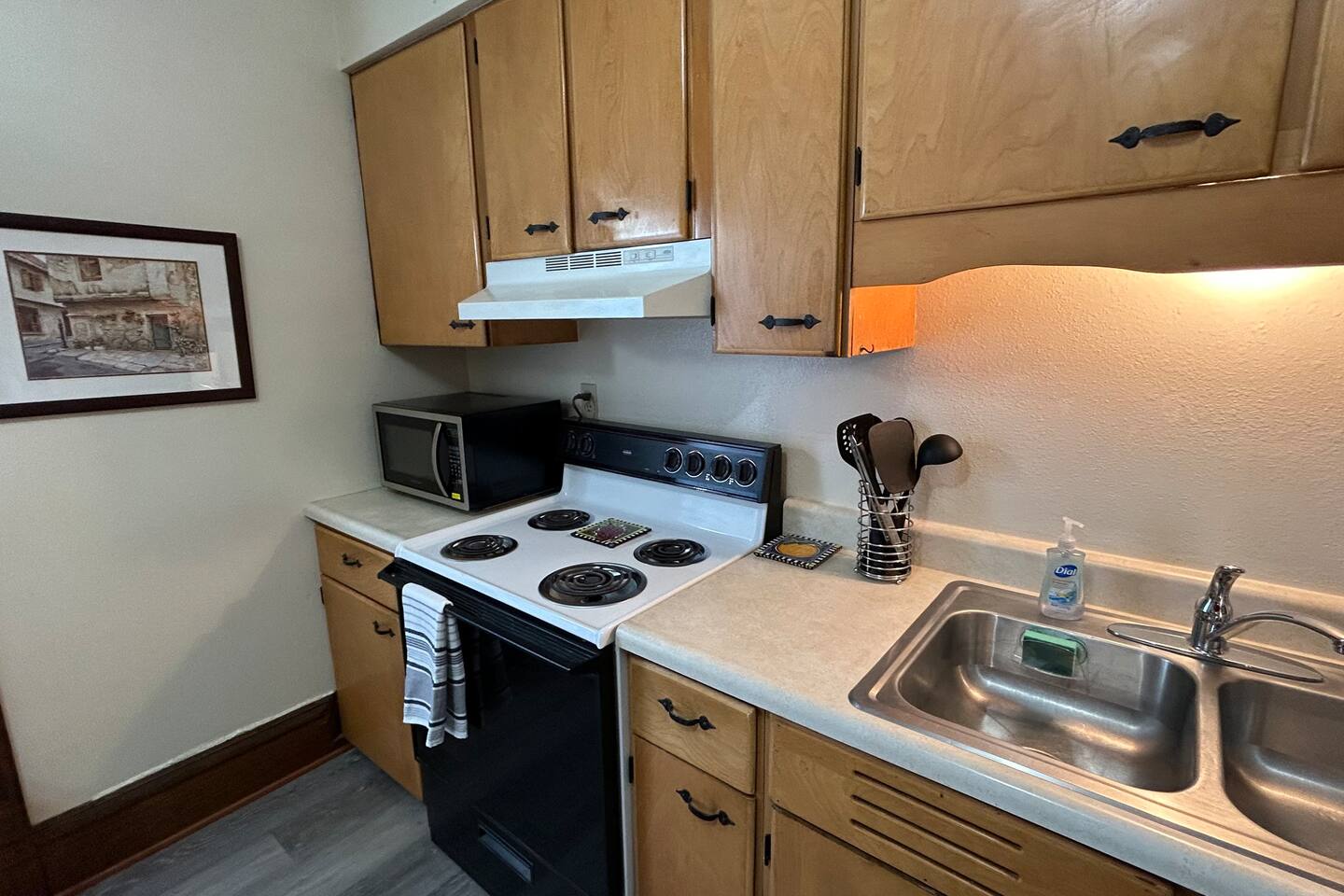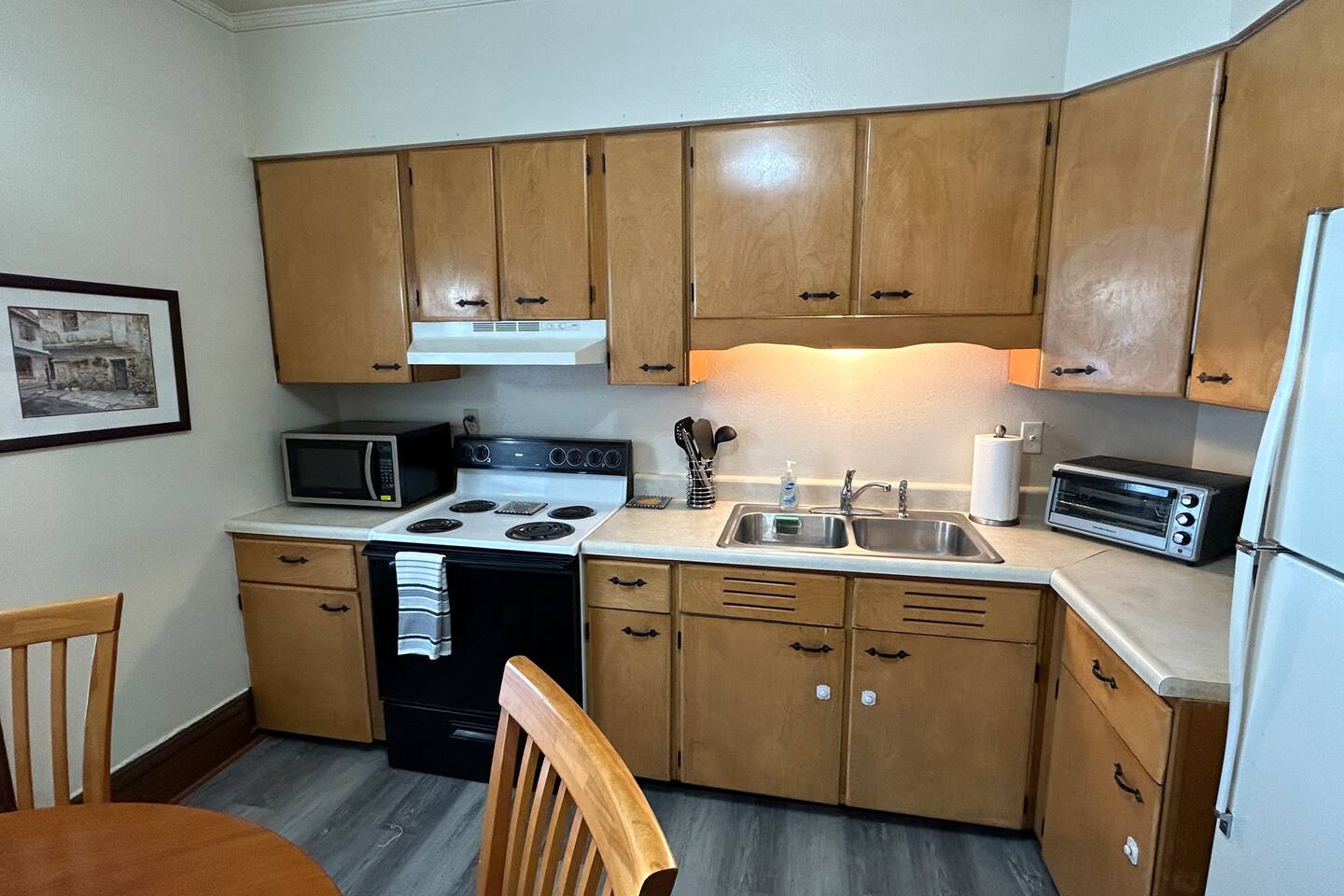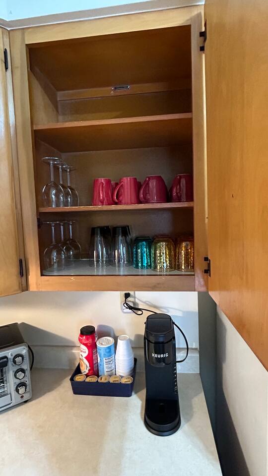 This central HVAC condo has a fully appointed kitchen, a 55' Smart TV with high speed Wi-Fi, and working area, desk, and chair. In-garage parking available.