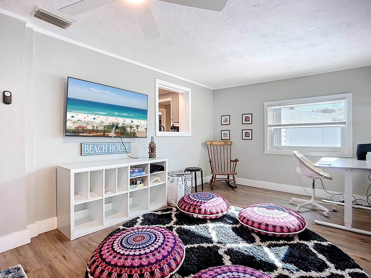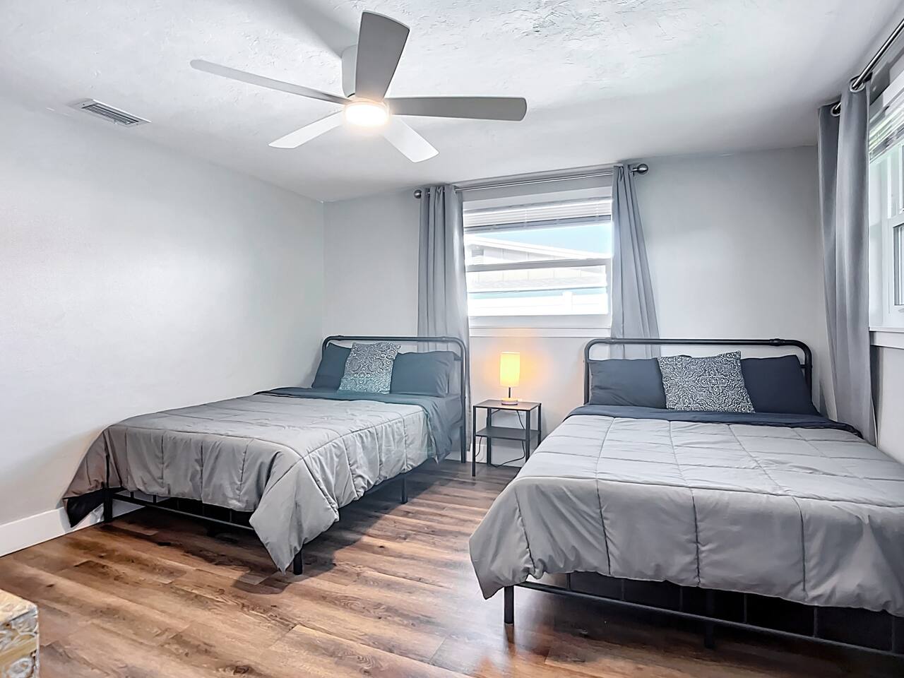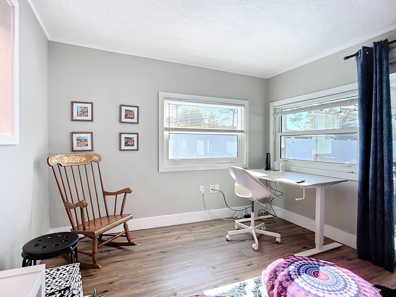 1st bedroom: one King Bed 2nd bedroom: one Queen Bed 3rd bedroom: two full beds Two Full Bathrooms, one large with two sinks and a bathtub and the other one with a large stand-up shower and a sink. Additionally, you have one recreational room with a comfortable Queen sleeper sofa (blue one in the pictures) and an office with High Speed Wi-Fi and a large desk adjustable to standing or sitting. Please let us know if you’d like us to leave the queen sofa bed set up before your arrival!! There are three large smart TVs throughout the house (one in King Bedroom, one in Living Room and one in the Recreational Room). A fully fenced in large sunny private backyard with a large furnished comfortable lanai to complete your stay. An additional table with 4 more chairs is located off the lanai in a Sunny spot on the east side patio, to enjoy breakfast or the sunset. There’s chaise lounges located on the south side of the lanai. We provide beach chairs and beach towels for our guests.